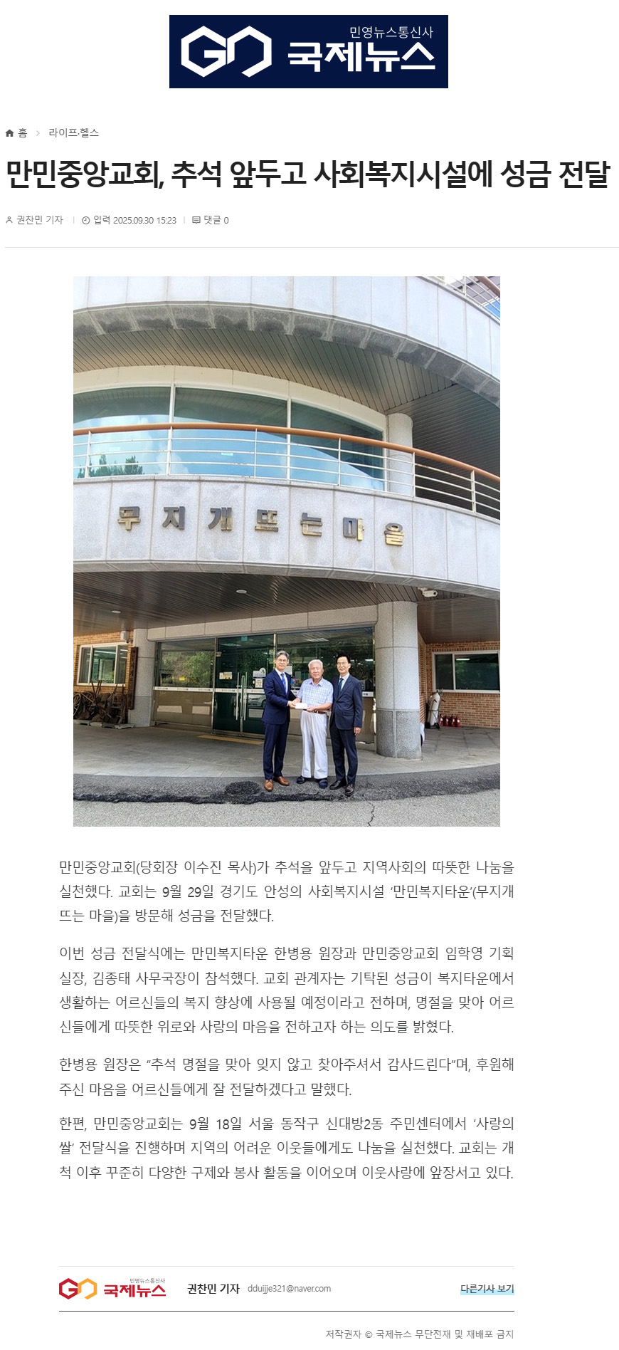 ¸¸¹ÎÁß¾Ó±³È¸(´çȸÀå À̼öÁø ¸ñ»ç)°¡ Ãß¼®À» ¾ÕµÎ°í Áö¿ª»çȸÀÇ µû¶æÇÑ ³ª´®À» ½ÇõÇß´Ù. ±³È¸´Â 9¿ù 29ÀÏ °æ±âµµ ¾È¼ºÀÇ »çȸº¹Áö½Ã¼³ '¸¸¹Îº¹ÁöŸ¿î'(¹«Áö°³ ¶ß´Â ¸¶À»)À» ¹æ¹®ÇØ ¼º±ÝÀ» Àü´ÞÇß´Ù. ...