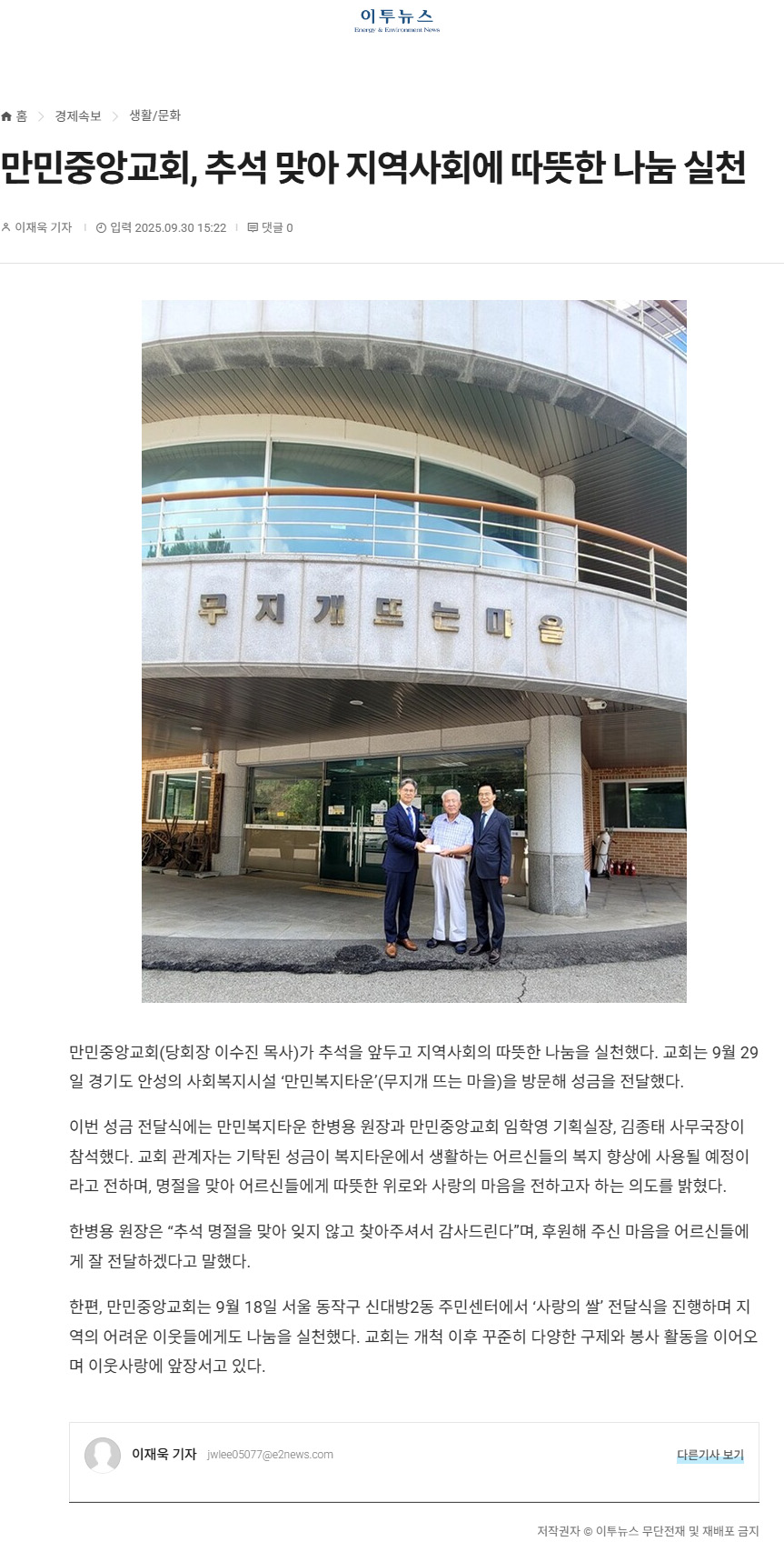 ¸¸¹ÎÁß¾Ó±³È¸(´çȸÀå À̼öÁø ¸ñ»ç)°¡ Ãß¼®À» ¾ÕµÎ°í Áö¿ª»çȸÀÇ µû¶æÇÑ ³ª´®À» ½ÇõÇß´Ù. ±³È¸´Â 9¿ù 29ÀÏ °æ±âµµ ¾È¼ºÀÇ »çȸº¹Áö½Ã¼³ '¸¸¹Îº¹ÁöŸ¿î'(¹«Áö°³ ¶ß´Â ¸¶À»)À» ¹æ¹®ÇØ ¼º±ÝÀ» Àü´ÞÇß´Ù. ...