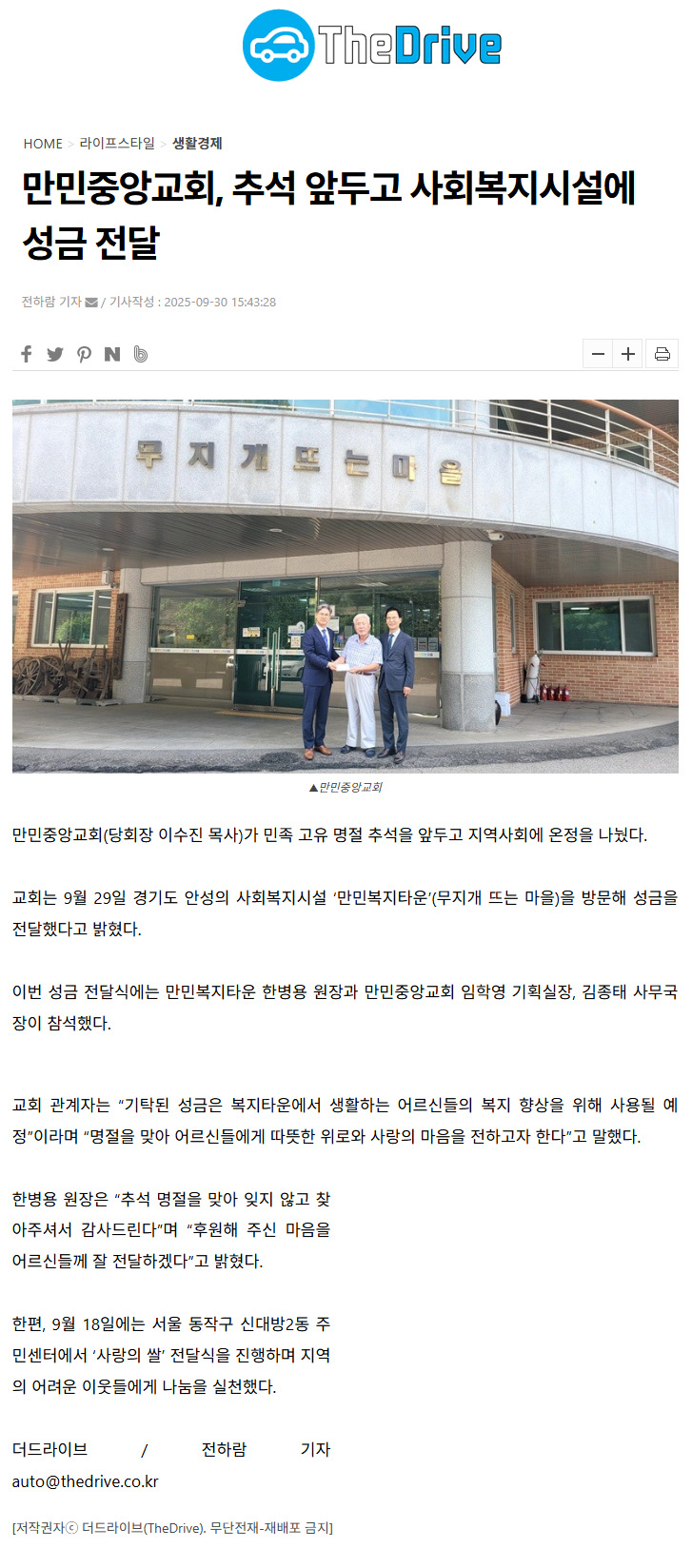 ¸¸¹ÎÁß¾Ó±³È¸(´çȸÀå À̼öÁø ¸ñ»ç)°¡ Ãß¼®À» ¾ÕµÎ°í Áö¿ª»çȸÀÇ µû¶æÇÑ ³ª´®À» ½ÇõÇß´Ù. ±³È¸´Â 9¿ù 29ÀÏ °æ±âµµ ¾È¼ºÀÇ »çȸº¹Áö½Ã¼³ '¸¸¹Îº¹ÁöŸ¿î'(¹«Áö°³ ¶ß´Â ¸¶À»)À» ¹æ¹®ÇØ ¼º±ÝÀ» Àü´ÞÇß´Ù. ...