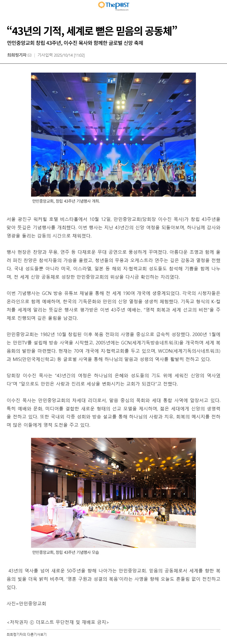 [K°æÂûÀϺ¸]¸¸¹ÎÁß¾Ó±³È¸(´çȸÀå À̼öÁø ¸ñ»ç), ⸳ 43Áֳ⠱â³äÇà»ç '±âµ¶±³ K-ÄÃó Àü¼¼°è¿¡ ¾Ë·Á' "½Å¾Ó°ú