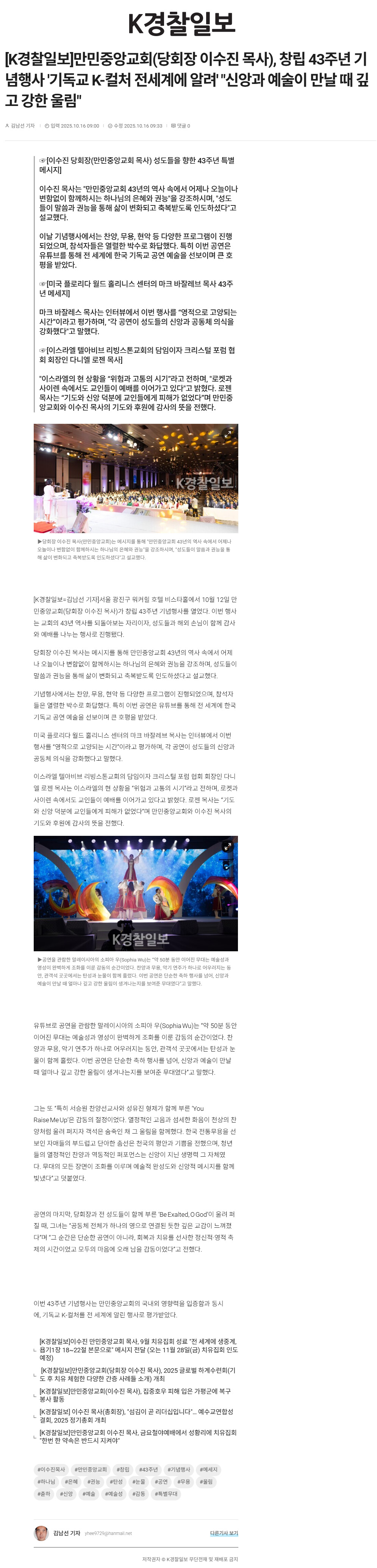 [K°æÂûÀϺ¸]¸¸¹ÎÁß¾Ó±³È¸(´çȸÀå À̼öÁø ¸ñ»ç), ⸳ 43Áֳ⠱â³äÇà»ç '±âµ¶±³ K-ÄÃó Àü¼¼°è¿¡ ¾Ë·Á' "½Å¾Ó°ú ¿¹¼úÀÌ ¸¸³¯ ¶§ ±í°í °ÇÑ ¿ï¸²"