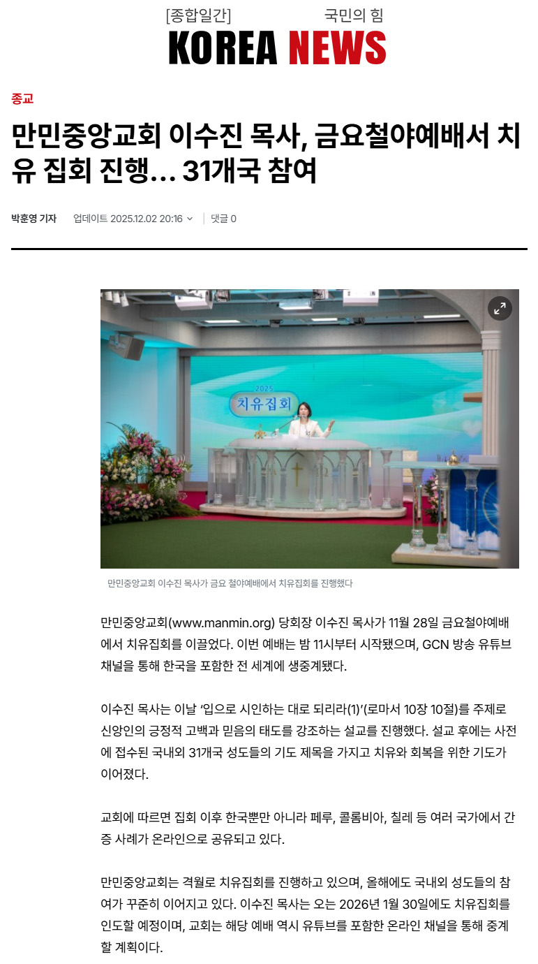 ¸¸¹ÎÁß¾Ó±³È¸(www.manmin.org) ´çȸÀå À̼öÁø ¸ñ»ç°¡ 11¿ù 28ÀÏ ±Ý¿äö¾ß¿¹¹è¿¡¼ Ä¡À¯Áýȸ¸¦ À̲ø¾ú´Ù. À̹ø ¿¹¹è´Â ¹ã 11½ÃºÎÅÍ ½ÃÀÛµÆÀ¸¸ç, GCN ¹æ¼Û À¯Æ©ºê ä³ÎÀ» ÅëÇØ Çѱ¹À» Æ÷ÇÔÇÑ Àü ¼¼°è¿¡ »ýÁß°èµÆ´Ù. ...
