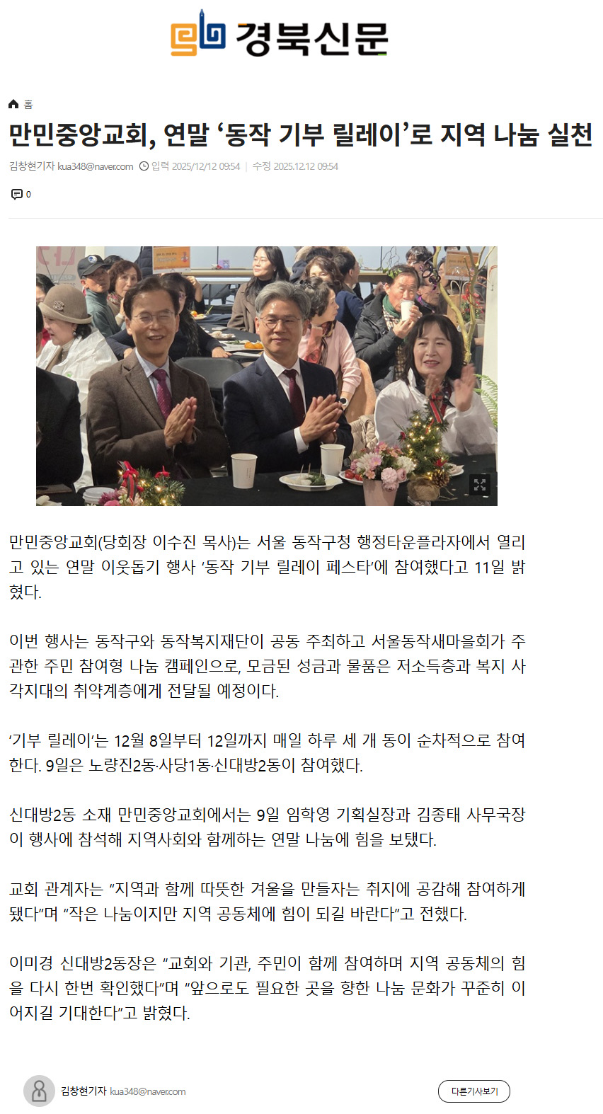 ¸¸¹ÎÁß¾Ó±³È¸, ¿¬¸» 'µ¿ÀÛ ±âºÎ ¸±·¹ÀÌ'·Î Áö¿ª ³ª´® ½Çõ