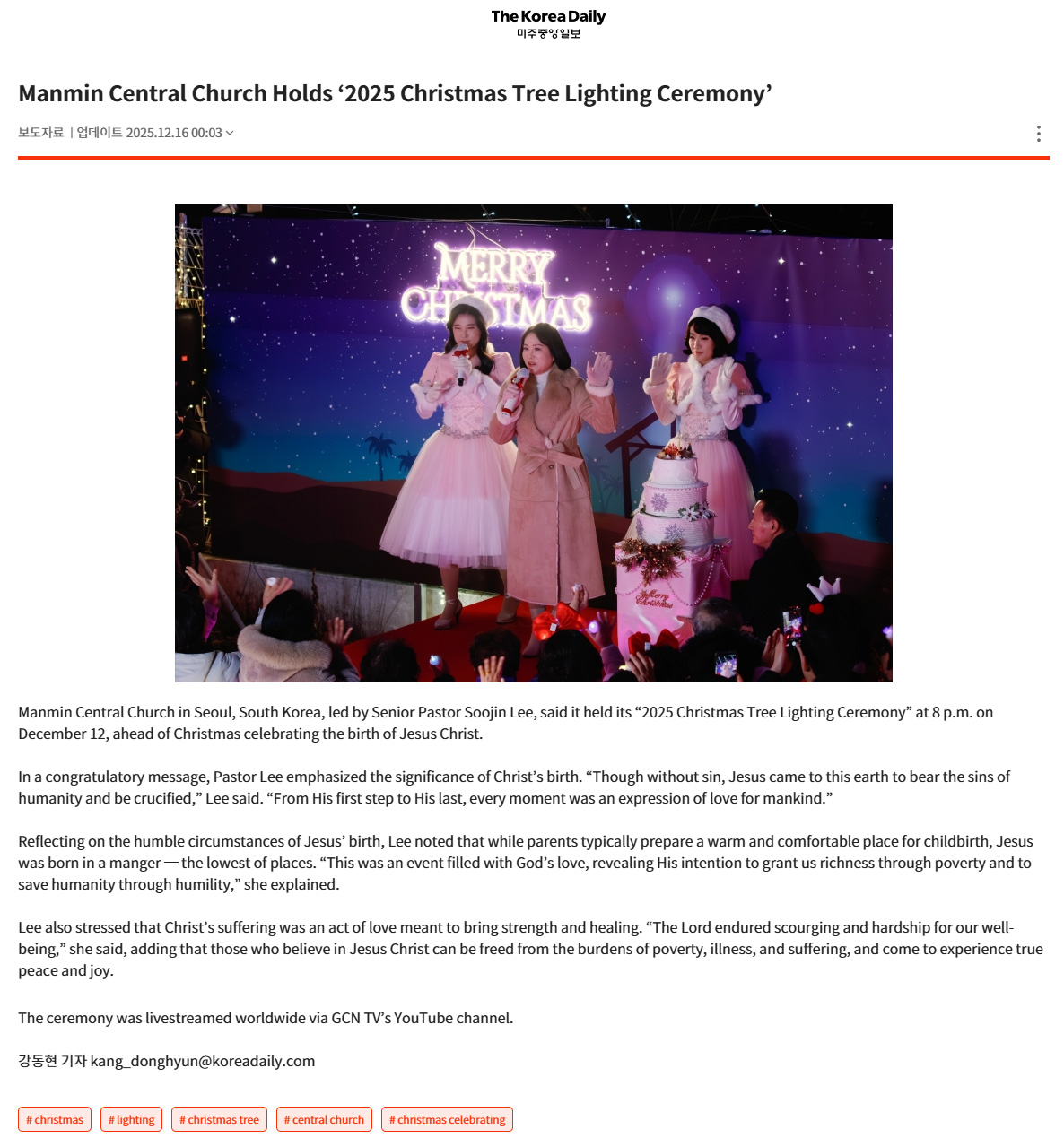 Manmin Central Church Holds 2025 Christmas Tree Lighting Ceremony
