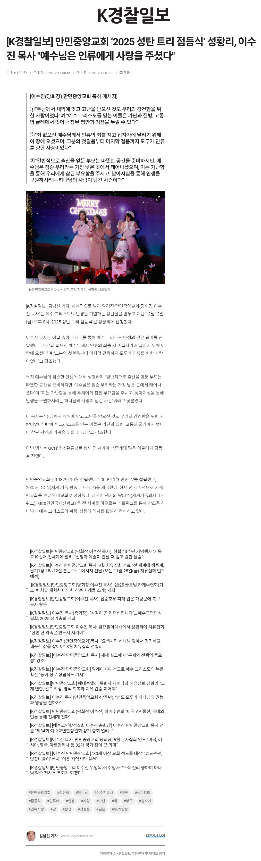 [K°æÂûÀϺ¸] ¸¸¹ÎÁß¾Ó±³È¸ '2025 ¼ºÅº Æ®¸® Á¡µî½Ä' ¼ºÈ²¸®, À̼öÁø ¸ñ»ç "¿¹¼ö´ÔÀº Àηù¿¡°Ô »ç¶ûÀ» Á̴ּÙ"