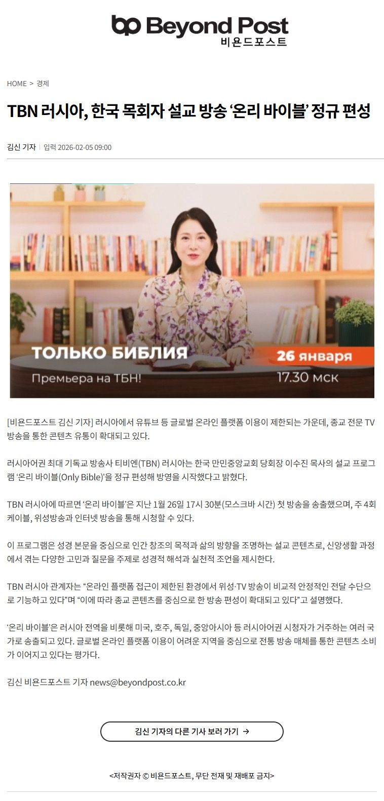 ·¯½Ã¾Æ¿¡¼ À¯Æ©ºê µî ±Û·Î¹ú ¿Â¶óÀÎ Ç÷§Æû ÀÌ¿ëÀÌ Á¦ÇѵǴ °¡¿îµ¥, Á¾±³ Àü¹® TV ¹æ¼ÛÀ» ÅëÇÑ ÄÜÅÙÃ÷ À¯ÅëÀÌ È®´ëµÇ°í ÀÖ´Ù. ·¯½Ã¾Æ¾î±Ç ÃÖ´ë ±âµ¶±³ ¹æ¼Û»ç Ƽºñ¿£(TBN) ·¯½Ã¾Æ´Â Çѱ¹ ¸¸¹ÎÁß¾Ó±³È¸ ´çȸÀå À̼öÁø ¸ñ»çÀÇ ¼³±³ ÇÁ·Î±×·¥ '¿Â¸® ¹ÙÀ̺í(Only Bible)'À» Á¤±Ô Æí¼ºÇØ ¹æ¿µÀ» ½ÃÀÛÇß´Ù°í ¹àÇû´Ù. ...