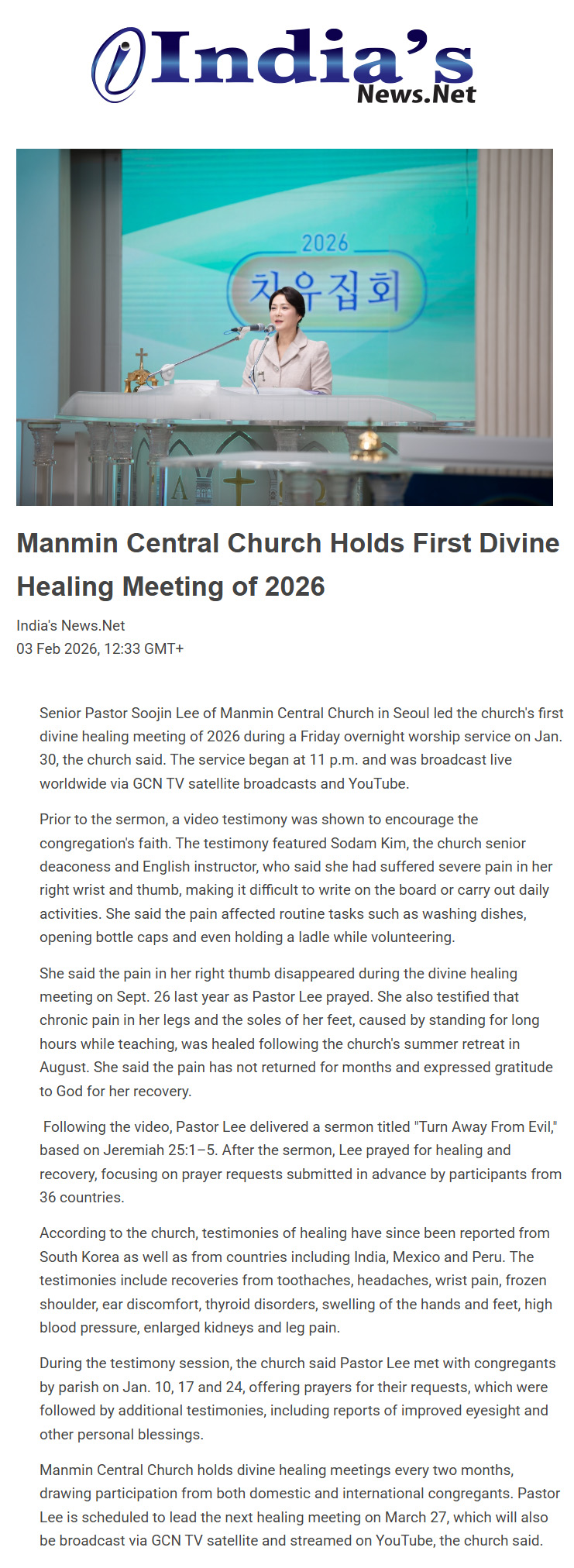 Manmin Central Church Holds First Divine Healing Meeting of 2026