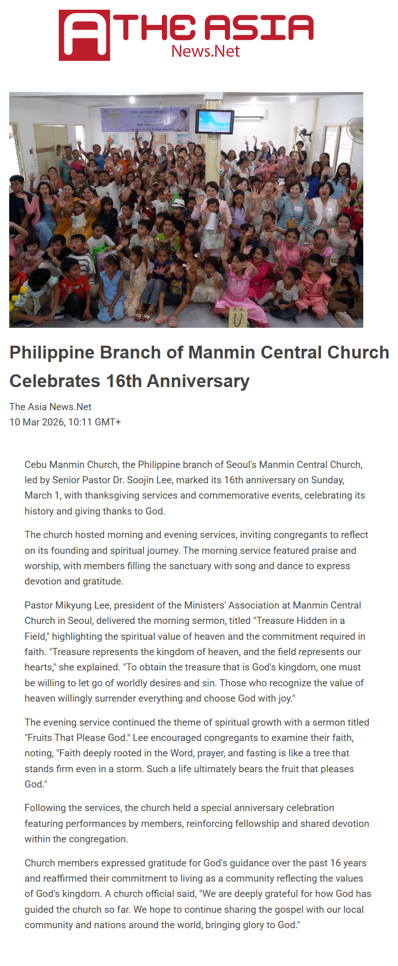 Cebu Manmin Church, the Philippine branch of Seoul's Manmin Central Church, led by Senior Pastor Dr. Soojin Lee, marked its 16th anniversary on Sunday, March 1, with thanksgiving services and commemorative events, celebrating its history and givi ...