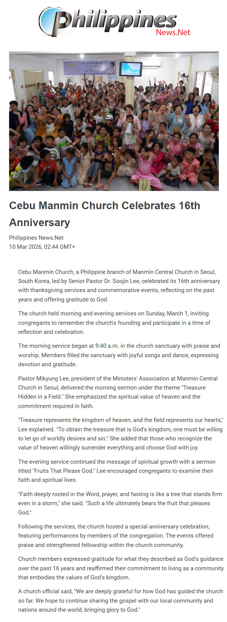 Cebu Manmin Church, the Philippine branch of Seoul's Manmin Central Church, led by Senior Pastor Dr. Soojin Lee, marked its 16th anniversary on Sunday, March 1, with thanksgiving services and commemorative events, celebrating its history and givi ...