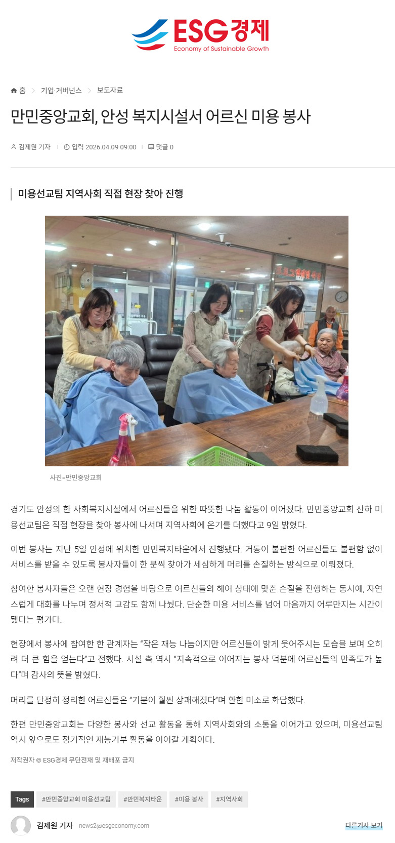 ¸¸¹ÎÁß¾Ó±³È¸, ¾È¼º º¹Áö½Ã¼³¼ ¾î¸£½Å ¹Ì¿ë ºÀ»ç