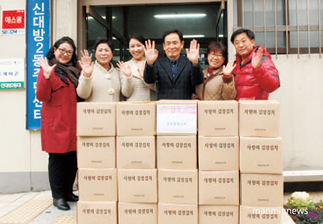 腌制好的白菜每层菜叶中间,满满填抹火红的辣椒调料和配菜,融入浓浓的关爱和真诚,分别以十一、二公斤的规格包装成箱,配送教会救济的家庭,并通过新大方二洞居民中心、九老区区立残疾人就业培训机构、韩国法务福祉保护公社等机关团体,分送未成年家长,独居老人等一千三百余户困难家庭。