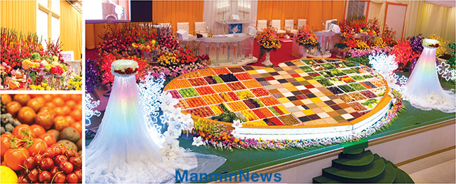 The altar was decorated with 292 kinds of the best quality grain, root vegetables, leafy vegetables, and fruits. They were put in a big heart-shaped frame. The front of the heart frame was ornamented with the decoration that reminds us of the golden and silver sand seashore banquet in New Jerusalem in Heaven.