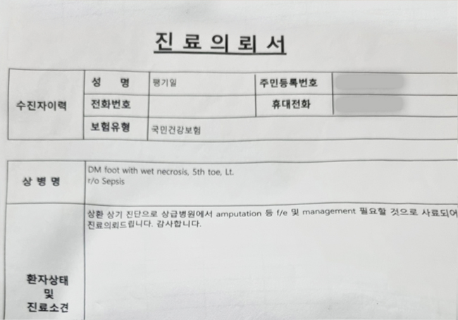 ▲ Referral Letter (Requires evaluation for possible amputation surgery and ongoing treatment at a higher-level hospital, Aug. 13, 2025)