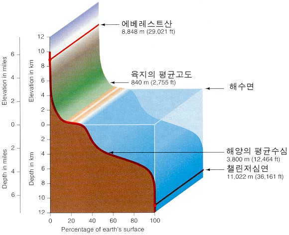 - Àü¼¼°è ÇØ¾çÀÇ ÃѸéÀû : 362¡¿10^6 km^2 ( Áö±¸ Ç¥¸éÀÇ ¾à 70.7%¿¡ ÇØ´ç) - ÇØ¾çÀÇ ºÎÇÇ : ¾à 1,350¡¿10^6 km^3 - ÇØ¾çÀÇ Æò±Õ ¼ö½É : ¾à 3,800 m - ¸¸ÀÏ Áö±¸ Ç¥¸éÀÌ »êÀ̳ª °è°î°ú °°Àº ÁöÇüÀÇ ±âº¹ÀÌ ¾øÀÌ ¸Å²öÇÏ´Ù¸é, Áö±¸´Â ¾à 2,400 m µÎ²²ÀÇ ÇØ¼ö·Î ¿ÏÀüÈ÷ µ¤ÀÏ °ÍÀÔ´Ï´Ù. - ´ë·úÀÇ Æò±Õ ³ôÀÌ : 840m - ´ë·úÀÇ °¡Àå ³ôÀº °÷ : ¿¡º£·¹½ºÆ® »êÀ¸·Î ÇØ¹ß 8,848m - ÇØ¾çÀÇ °¡Àå ±íÀº °÷ : 縰Àú ½É¿¬À¸·Î ¼ö½É 11,022m