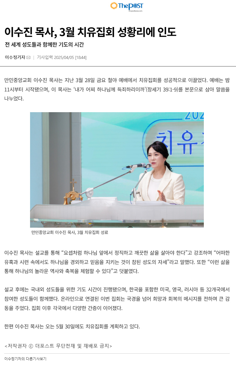 | 만민중앙교회(당회장 이수진 목사) 소속 미용인선교회가 지역 어르신을 위한 미용 재능봉사를 정기적으로 진행하고 있다. 이들은 두 달에 한 번 경기도 안성의 사회복지시설 '만민복지타운'을 방문해 치매 환자, 와상 환자 등 다양한 상황의 어르신을 대상으로 맞춤형 미용 서비스를 제공하고 있다. 지난 7일에도 봉사자들은 복지타운을 찾아 어르신들의 머리를 손질하며 단정한 일상을 돕는 시간을 가졌다. ... |