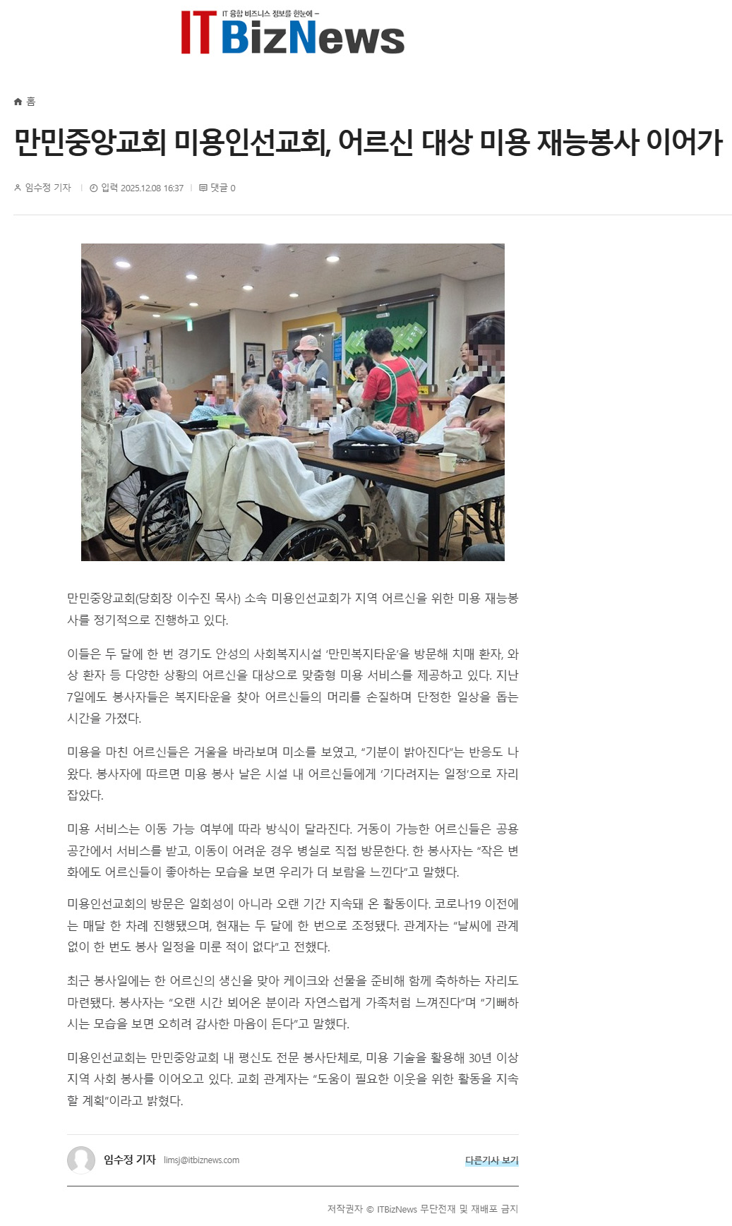 ¸¸¹ÎÁß¾Ó±³È¸(´çȸÀå À̼öÁø ¸ñ»ç) ¼Ò¼Ó ¹Ì¿ëÀμ±±³È¸°¡ Áö¿ª ¾î¸£½ÅÀ» À§ÇÑ ¹Ì¿ë Àç´ÉºÀ»ç¸¦ Á¤±âÀûÀ¸·Î ÁøÇàÇϰí ÀÖ´Ù. À̵éÀº µÎ ´Þ¿¡ ÇÑ ¹ø °æ±âµµ ¾È¼ºÀÇ »çȸº¹Áö½Ã¼³ '¸¸¹Îº¹ÁöŸ¿î'À» ¹æ¹®ÇØ Ä¡¸Å ȯÀÚ, ¿Í»ó ȯÀÚ µî ´Ù¾çÇÑ »óȲÀÇ ¾î¸£½ÅÀ» ´ë»óÀ¸·Î ¸ÂÃãÇü ¹Ì¿ë ¼ºñ½º¸¦ Á¦°øÇϰí ÀÖ´Ù. Áö³ 7ÀÏ¿¡µµ ºÀ»çÀÚµéÀº º¹ÁöŸ¿îÀ» ã¾Æ ¾î¸£½ÅµéÀÇ ¸Ó¸®¸¦ ¼ÕÁúÇÏ¸ç ´ÜÁ¤ÇÑ ÀÏ»óÀ» µ½´Â ½Ã°£À» °¡Á³´Ù. ...