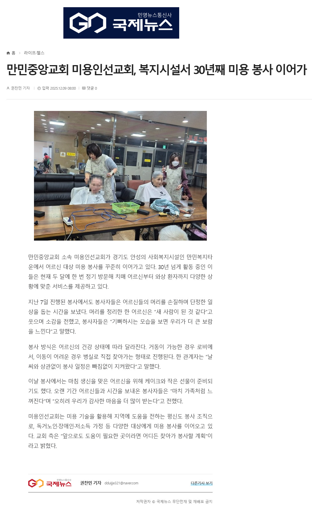 ¸¸¹ÎÁß¾Ó±³È¸(´çȸÀå À̼öÁø ¸ñ»ç) ¼Ò¼Ó ¹Ì¿ëÀμ±±³È¸°¡ Áö¿ª ¾î¸£½ÅÀ» À§ÇÑ ¹Ì¿ë Àç´ÉºÀ»ç¸¦ Á¤±âÀûÀ¸·Î ÁøÇàÇϰí ÀÖ´Ù. À̵éÀº µÎ ´Þ¿¡ ÇÑ ¹ø °æ±âµµ ¾È¼ºÀÇ »çȸº¹Áö½Ã¼³ '¸¸¹Îº¹ÁöŸ¿î'À» ¹æ¹®ÇØ Ä¡¸Å ȯÀÚ, ¿Í»ó ȯÀÚ µî ´Ù¾çÇÑ »óȲÀÇ ¾î¸£½ÅÀ» ´ë»óÀ¸·Î ¸ÂÃãÇü ¹Ì¿ë ¼ºñ½º¸¦ Á¦°øÇϰí ÀÖ´Ù. Áö³ 7ÀÏ¿¡µµ ºÀ»çÀÚµéÀº º¹ÁöŸ¿îÀ» ã¾Æ ¾î¸£½ÅµéÀÇ ¸Ó¸®¸¦ ¼ÕÁúÇÏ¸ç ´ÜÁ¤ÇÑ ÀÏ»óÀ» µ½´Â ½Ã°£À» °¡Á³´Ù. ...