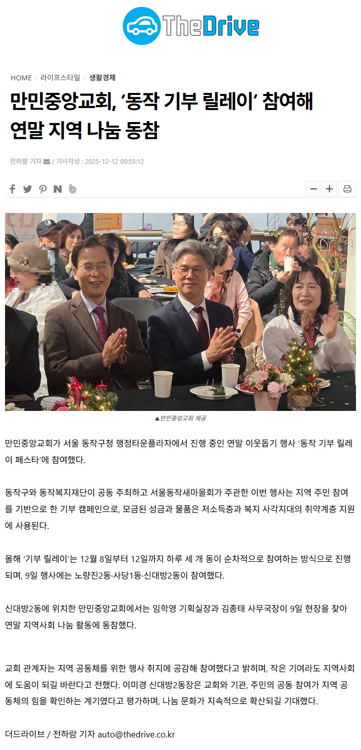 ¸¸¹ÎÁß¾Ó±³È¸, 'µ¿ÀÛ ±âºÎ ¸±·¹ÀÌ' Âü¿©ÇØ ¿¬¸» Áö¿ª ³ª´® µ¿Âü