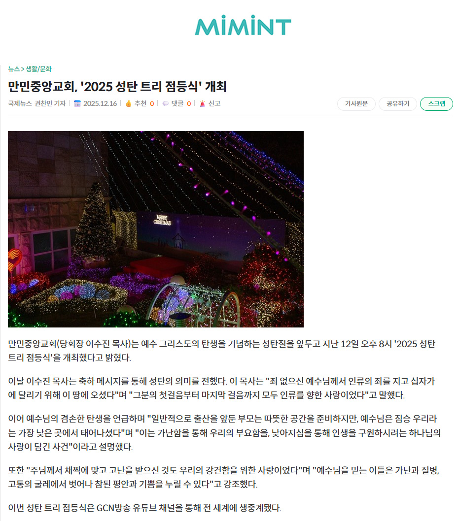 ¸¸¹ÎÁß¾Ó±³È¸, '2025 ¼ºÅº Æ®¸® Á¡µî½Ä' °³ÃÖ
