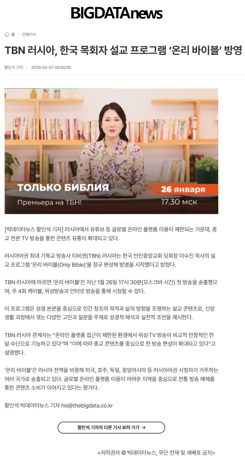 TBN ·¯½Ã¾Æ, Çѱ¹ ¸ñȸÀÚ ¼³±³ ÇÁ·Î±×·¥ '¿Â¸® ¹ÙÀ̺í' ¹æ¿µ