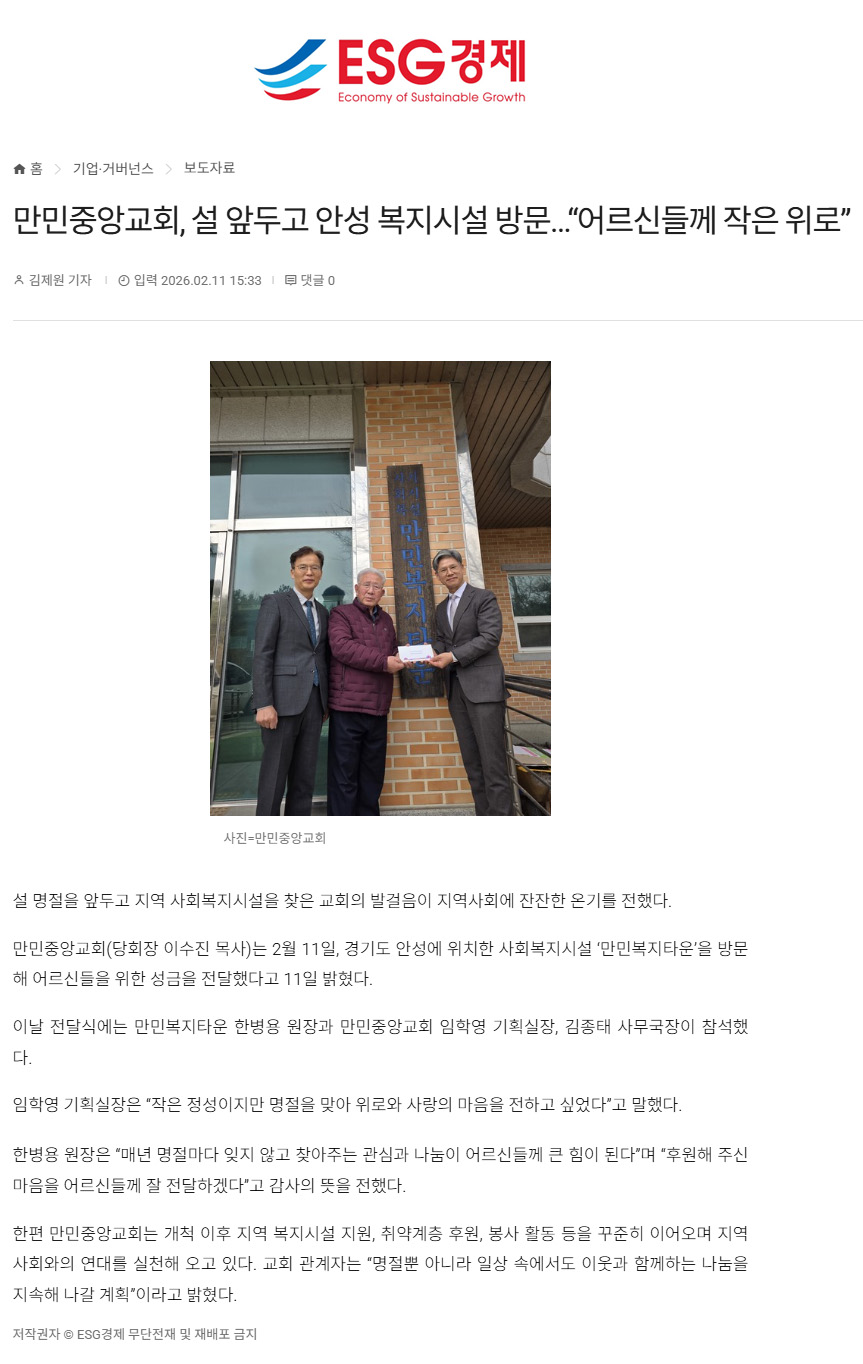 ¼³ ¸íÀýÀ» ¾ÕµÎ°í Áö¿ª »çȸº¹Áö½Ã¼³À» ãÀº ±³È¸ÀÇ ¹ß°ÉÀ½ÀÌ Áö¿ª»çȸ¿¡ ÀÜÀÜÇÑ ¿Â±â¸¦ ÀüÇß´Ù. ¸¸¹ÎÁß¾Ó±³È¸(´çȸÀå À̼öÁø ¸ñ»ç)´Â 2¿ù 11ÀÏ, °æ±âµµ ¾È¼º¿¡ À§Ä¡ÇÑ »çȸº¹Áö½Ã¼³ '¸¸¹Îº¹ÁöŸ¿î'À» ¹æ¹®ÇØ ¾î¸£½ÅµéÀ» À§ÇÑ ¼º±ÝÀ» Àü´ÞÇß´Ù. ...