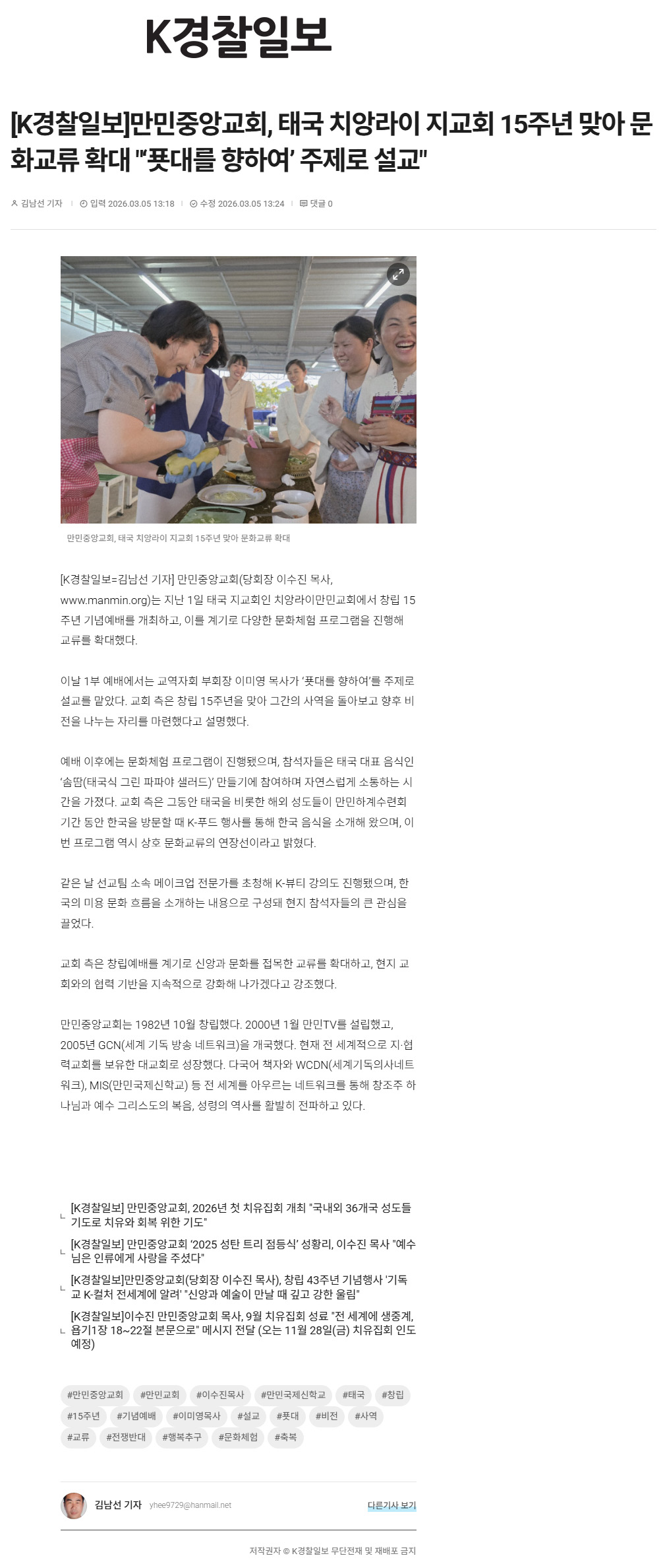 [K경찰일보]만민중앙교회, 태국 치앙라이 지교회 15주년 맞아 문화교류 확대 "'푯대를 향하여' 주제로 설교"