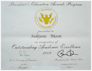 Áö³ 7¿ù 3ÀÏ, ¹Ì±¹¿¡ ¿Â Áö ¸¸ 3³âÀÌ µÇ´Â ³¯À̾ú½À´Ï´Ù. ¾Æµé ¼®ÁØÀÌ Çб³¿¡¼ ¿ìÆí¹°ÀÌ ¿Ô½À´Ï´Ù. ¿¾îº¸´Ï, ¹Ì±¹ ¿À¹Ù¸¶ ´ëÅë·É »ó(President's Education Award Program) ÃÖ¿ì¼ö»ó(Excellence) »óÀåÀÌ µé¾î ÀÖ¾ú½À´Ï´Ù. ÀÌ »óÀº ¿ì¼öÇÑ ¼ºÀû°ú ÇÔ²² ¿©·¯ ºÐ¾ß¿¡¼ Ź¿ùÇÑ Çлý¿¡°Ô ÁÖ´Â »óÀÔ´Ï´Ù. ¼®ÁØÀÌ´Â ´Ã ±àÁ¤Àû »ý°¢À» Çϸç, ¼¼»ó¿¡ ¹°µéÁö ¾Ê°íÀÚ ¸¶À½À» Áö۱â Èû¾²´Â ´ë°ßÇÑ ¾ÆµéÀÔ´Ï´Ù. ½Å·É°ú ÁøÁ¤À¸·Î ¿¹¹èÇϸç, ¹«¾ùÀ̵ç Çϳª´Ô²² µå¸®±â¸¦ Áñ°ÜÇÏÁö¿ä.