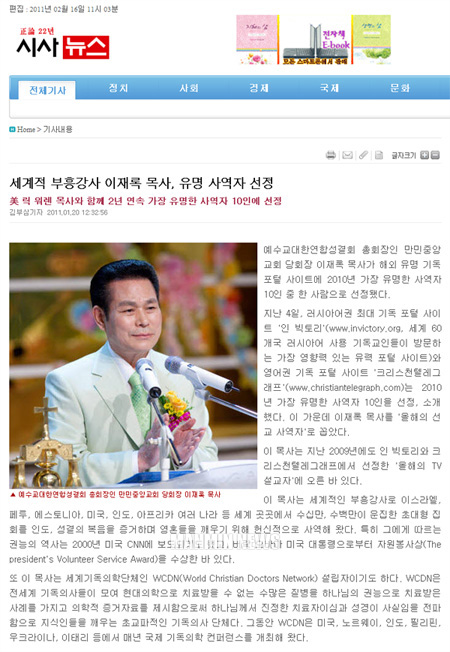 ¿¹¼ö±³´ëÇÑ¿¬ÇÕ¼º°áȸ ÃÑȸÀåÀÎ ¸¸¹ÎÁß¾Ó±³È¸ ´çȸÀå ÀÌÀç·Ï ¸ñ»ç°¡ ÇØ¿Ü À¯¸í ±âµ¶ Æ÷ÅÐ »çÀÌÆ®¿¡ 2010³â °¡Àå À¯¸íÇÑ »ç¿ªÀÚ 10ÀÎ Áß ÇÑ »ç¶÷À¸·Î ¼±Á¤µÆ´Ù.