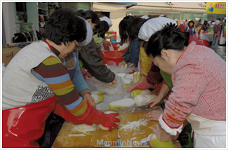 Ранним утром следующего дня, еще до рассвета, 50 членов миссии собрались для того, чтобы промыть капусту, лежавшую в рассоле. «Вы так рано пришли промывать капусту?» - «Да. Ее надо вымыть, вода должна стечь, только потом можно положить соус для кимчи между листьями», - ответила дьяконисса Сан Хи Хван. После обеда, в час дня, женщины приступили к работе. Засучив рукава, они принялись делать соус для кимчи из нарезанных овощей и специй. Снаряженные красными хозяйственными резиновыми перчатками, передниками, поварскими колпаками и даже масками для лица, члены женской миссии стали перекладывать капусту на стол. Поднимая лист за листом, они заправляли кочаны красным острым соусом для кимчи. И делали они это очень профессионально. Их руки двигались быстро и грациозно. «Какая чудесная погода!» - сказала с волнением дьяконисса Чун Ми Ли. Она впервые участвовала в подобном мероприятии и была уверена, что Богу угодно то, что они делают, и Он посылает им хорошую погоду. Улыбаясь, она продолжила: «Несмотря на то, что я впервые делала кимчи, но, зная, что этим помогаю нуждающимся, я работала с радостью». Температура воздуха - плюс тринадцать по Цельсию. Это был очень теплый день, если учесть, что зима не за горами. На лбу у добровольцев даже выступили капельки пота. В семь часов вечера три тысячи кочанов капусты были заготовлены на зиму, превратившись во вкусное «кимжанг кимчи».