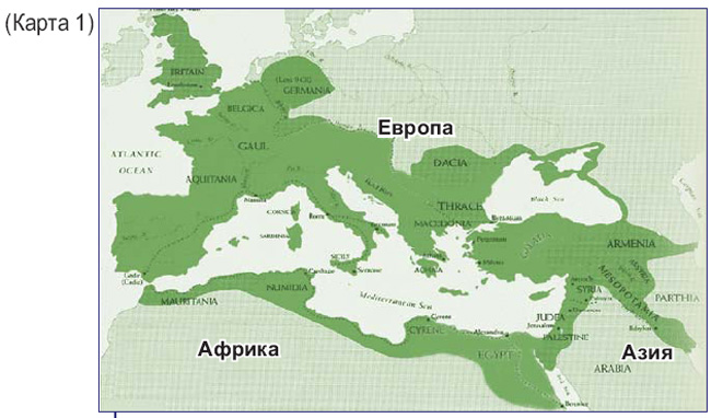 (Карта1) В 117 году Новый Завет, пришедший из Израиля, смог распространиться по миру очень быстро, так как Римская империя располагала обширнейшей территорией в мире с центром в Средиземноморье. В 330-м году Константин Великий (306 – 337 гг.) перенес столицу из Рима в Византию, которую назвал «Новый Рим». В честь Константина ее называли также Константинополем (ныне Стамбул, Турция).
